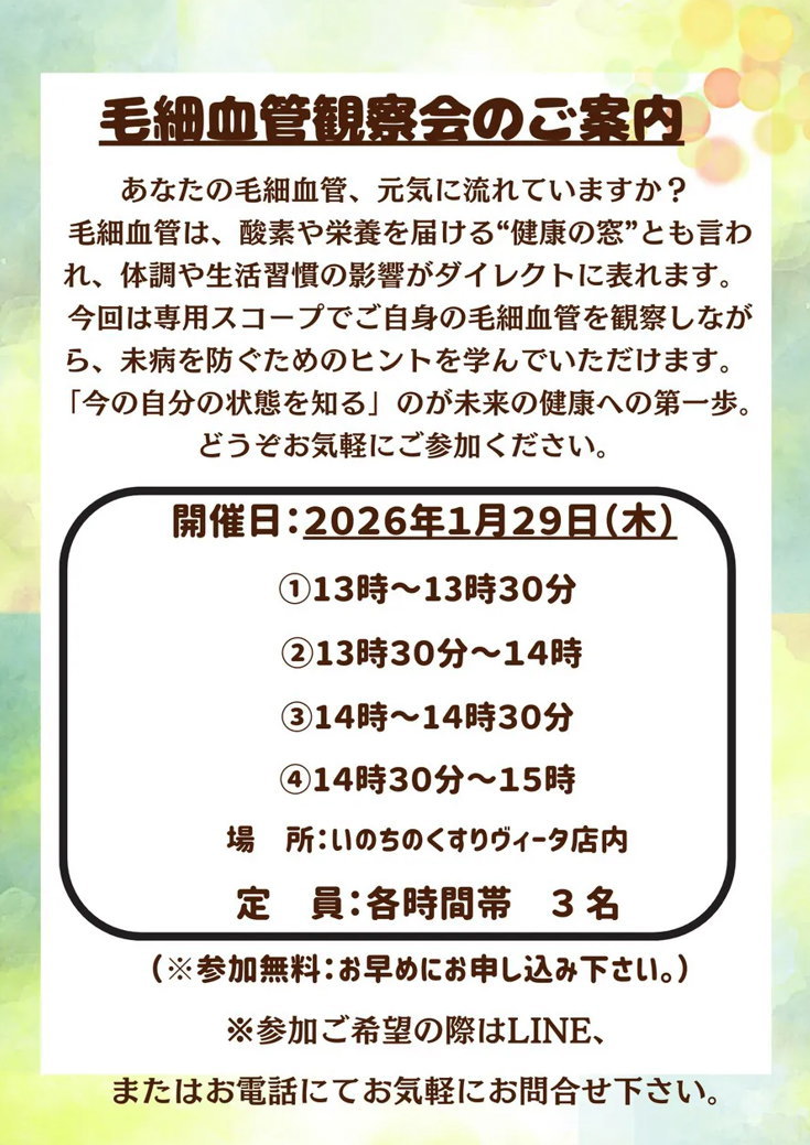 1月29日(木)開催の「毛細血管観察会」ですが、好評につき14:30の枠は満席となりました。